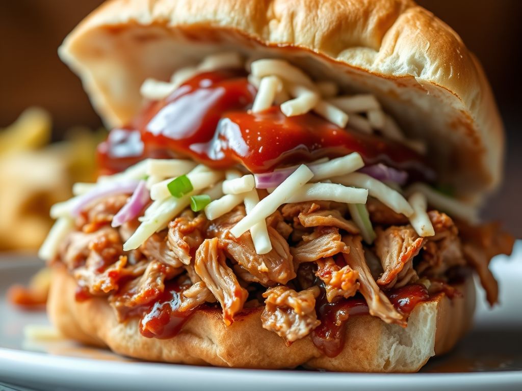 Stir BBQ sauce, apple cider vinegar, chicken broth, brown sugar, Italian seasoning, garlic powder, chili powder, salt, pepper and onion together in a slow cooker.